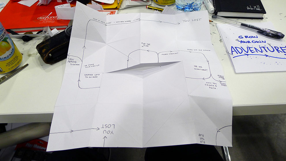 Grow Your Own Adventure is a “choose your own adventure game” made from a single sheet of paper. It was made in about four hours and a half at Gamecraft Unplugged.